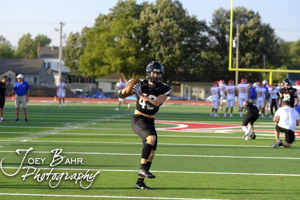 Great Bend Panther #40 Colton Brack lands with the caught ball. The Great Bend Panthers defeated the Dodge City Red Demons in a Western Athletic Conference matchup played at Memorial Stadium in Great Bend, Kansas on September 29, 2023. (Photo: Joey Bahr, www.joeybahr.com)undefined