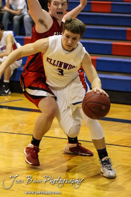 Ellinwood Eagle Kaleb Schartz (#3) drives towards the basket during the 2A Sub-State First Round Game with the Ellinwood Eagles vs the Ell-Saline Cardinals with Ellinwood winning 59 to 37 at Ellinwood High School in Ellinwood, Kansas on March 2, 2015. (Photo: Joey Bahr, www.joeybahr.com)