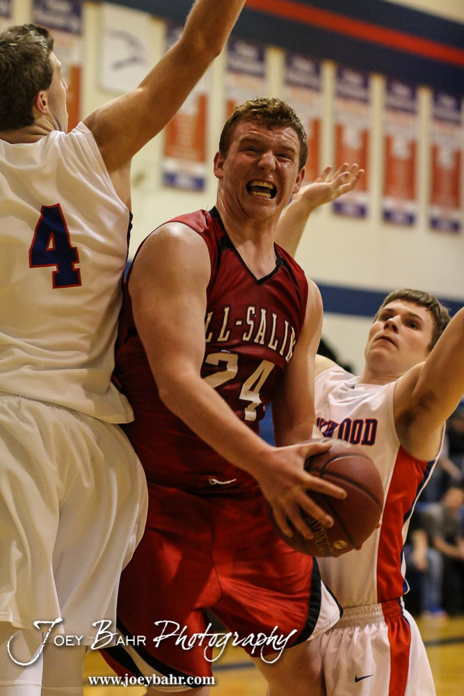 Ell-Saline Cardinal Koby Ingalsbe (#24) goes up for a layup during the 2A Sub-State First Round Game with the Ellinwood Eagles vs the Ell-Saline Cardinals with Ellinwood winning 59 to 37 at Ellinwood High School in Ellinwood, Kansas on March 2, 2015. (Photo: Joey Bahr, www.joeybahr.com)