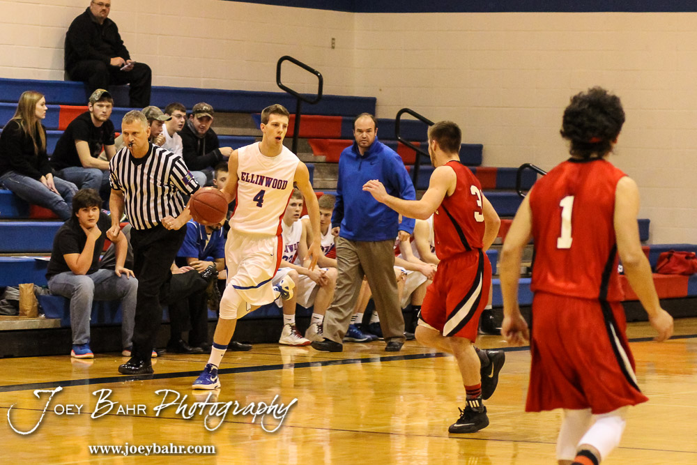 Ellinwood Eagle Marc Waite (#4) drives down the court during the 2A Sub-State First Round Game with the Ellinwood Eagles vs the Ell-Saline Cardinals with Ellinwood winning 59 to 37 at Ellinwood High School in Ellinwood, Kansas on March 2, 2015. (Photo: Joey Bahr, www.joeybahr.com)