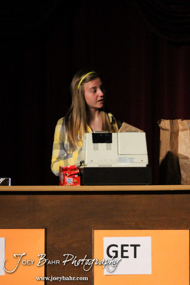 Kansas played by Kaylan Lagerman tells a story during the Great Bend Community Theater’s final rehearsal of “Duck Hunter Shoots Angel” by Mitch Albom at Crest Theater in Great Bend, Kansas on April 17, 2013. (Photo: Joey Bahr, www.joeybahr.com)