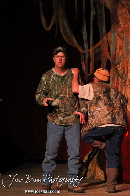 Duwell played by Charlie Dixon sees an angel while Duane played by K.B. Bell looks for a stick during the Great Bend Community Theater’s final rehearsal of “Duck Hunter Shoots Angel” by Mitch Albom at Crest Theater in Great Bend, Kansas on April 17, 2013. (Photo: Joey Bahr, www.joeybahr.com)