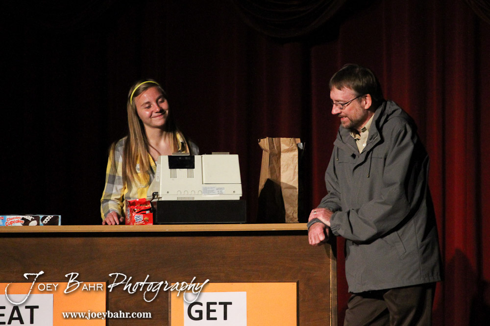 Kansas played by Kaylan Lagerman and Sandy played by Doug Simmons share a laugh during the Great Bend Community Theater’s final rehearsal of “Duck Hunter Shoots Angel” by Mitch Albom at Crest Theater in Great Bend, Kansas on April 17, 2013. (Photo: Joey Bahr, www.joeybahr.com)