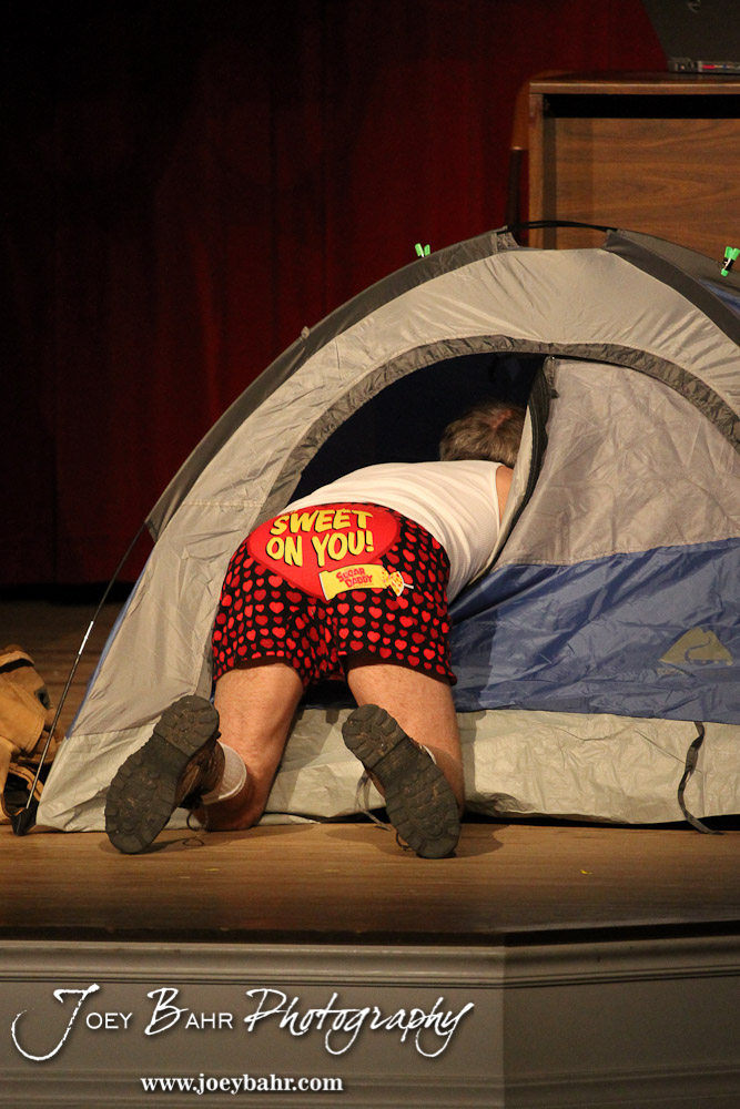 Duane played by K.B. Bell searches a tent during the Great Bend Community Theater’s final rehearsal of “Duck Hunter Shoots Angel” by Mitch Albom at Crest Theater in Great Bend, Kansas on April 17, 2013. (Photo: Joey Bahr, www.joeybahr.com)