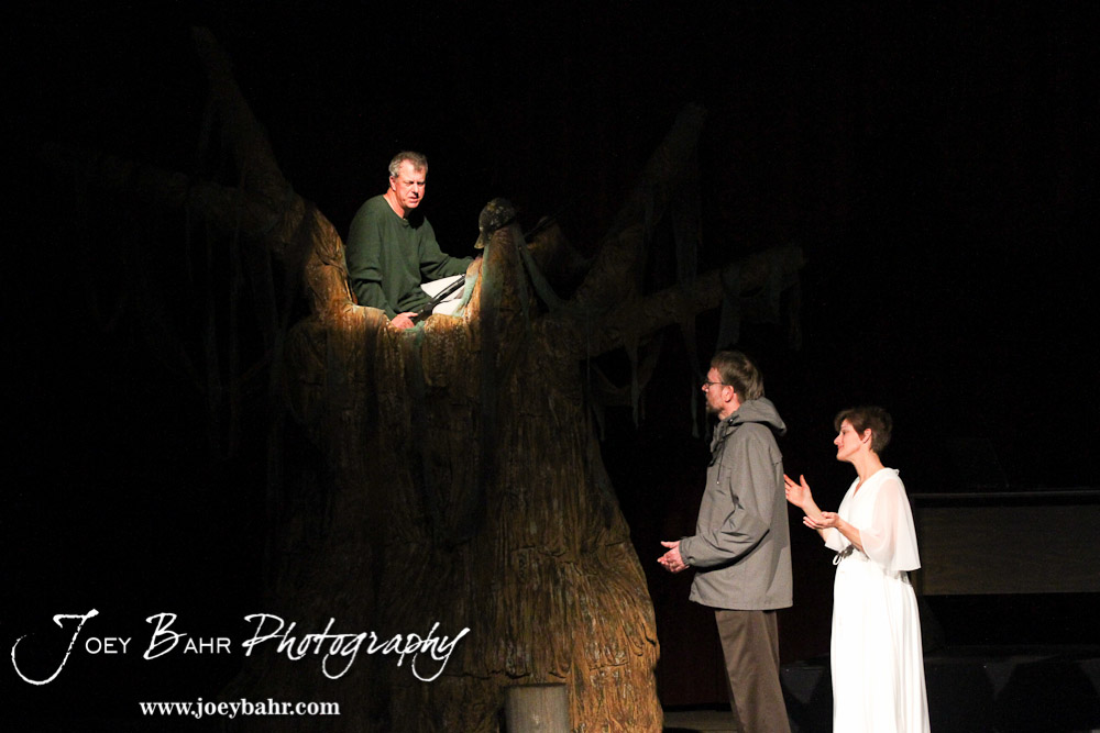 Duwell played by Charlie Dixon talks to Sandy played by Doug Simmons while Woman played by Claudia Wyatt watches during the Great Bend Community Theater’s final rehearsal of “Duck Hunter Shoots Angel” by Mitch Albom at Crest Theater in Great Bend, Kansas on April 17, 2013. (Photo: Joey Bahr, www.joeybahr.com)