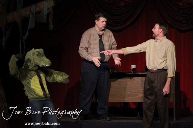 Gator Creature/Phil played by Lynn Benefield, Lester played by Jeff Gibson, and Sandy played by Doug Simmons perform during the Great Bend Community Theater’s final rehearsal of “Duck Hunter Shoots Angel” by Mitch Albom at Crest Theater in Great Bend, Kansas on April 17, 2013. (Photo: Joey Bahr, www.joeybahr.com)