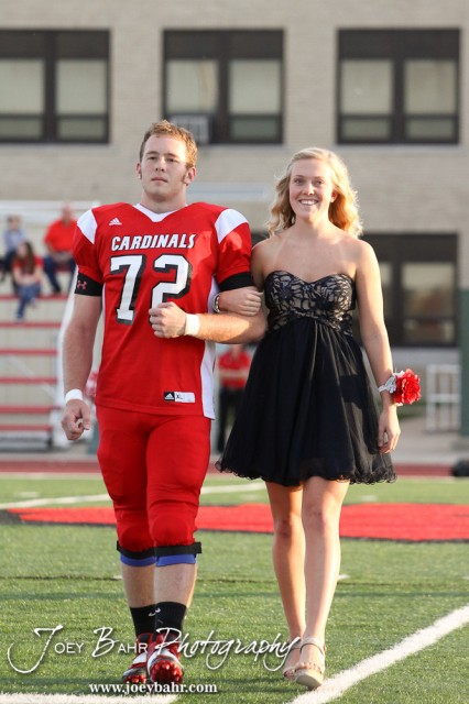Candidates Abi Rziha and Kagan Blackwell walk out during the 2013 Hoisington High School Homecoming Festivities prior to the Larned at Hoisington Football game at Elton Brown Field in Hoisington, Kansas on October 11, 2013. (Photo: Joey Bahr, www.joeybahr.com)