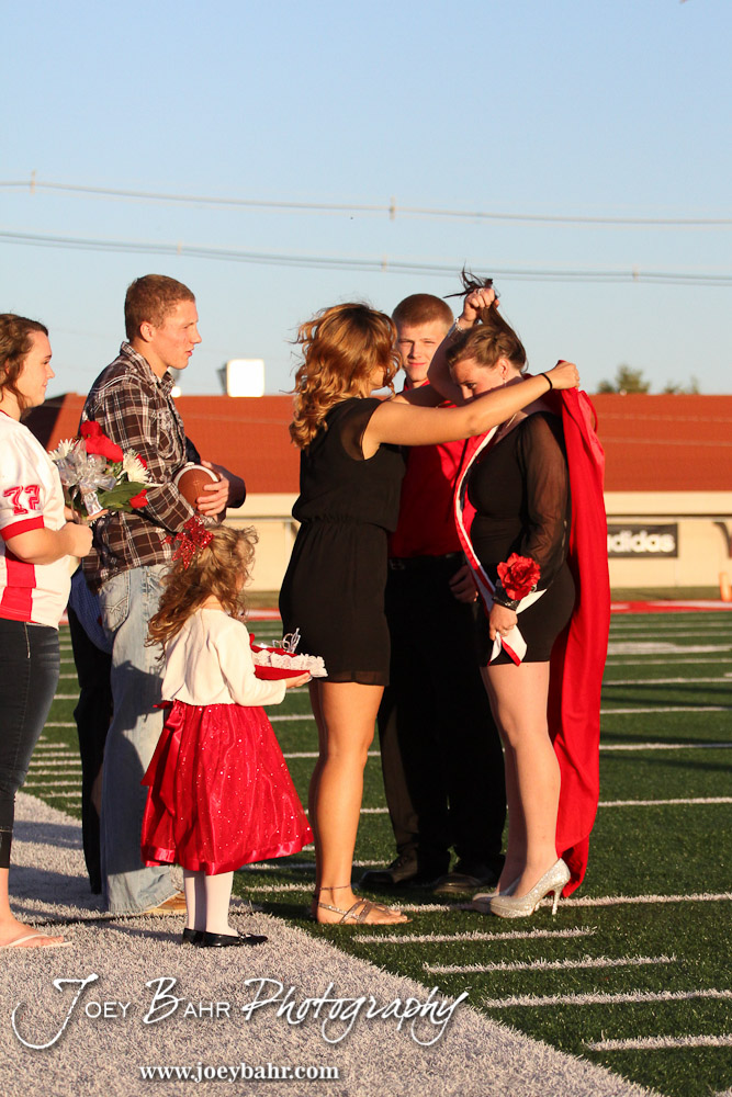 The Past Queen puts on the robe to the newly crowned Queen, Deiah Curtis, during the 2013 Hoisington High School Homecoming Festivities prior to the Larned at Hoisington Football game at Elton Brown Field in Hoisington, Kansas on October 11, 2013. (Photo: Joey Bahr, www.joeybahr.com)