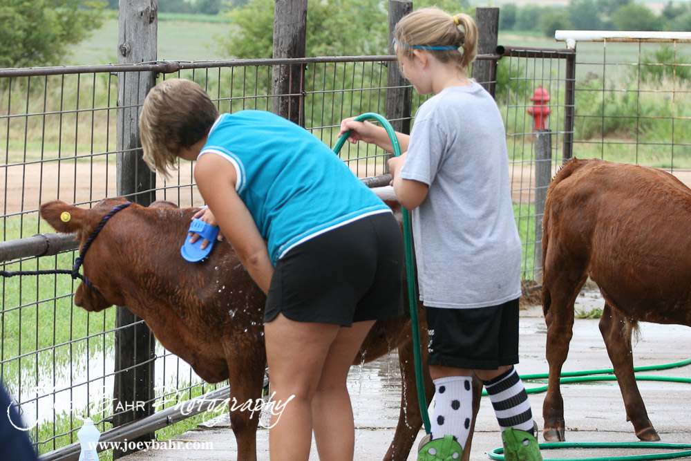 Camie and Jenna Hlavaty wash Jenna’s bucket calf, Rosie, before the 4-H Beef show at the 2011 Rush County Fair in LaCrosse, Kansas on Friday, August 5, 2011.