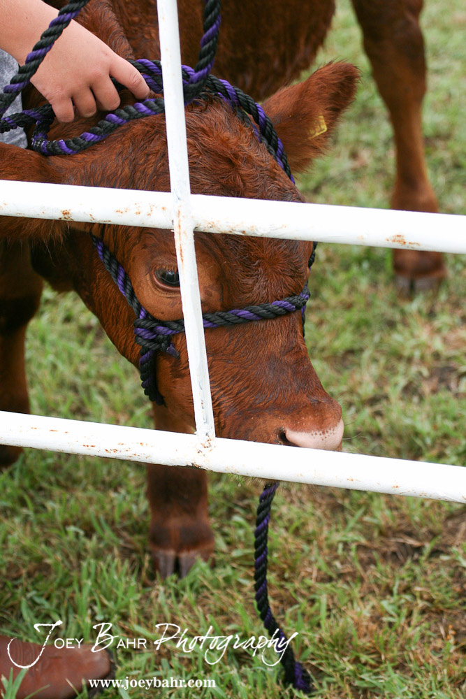 Rosie, Jenna Hlavaty’s bucket calf, looks through a fence while waiting to be groomed for the 4-H Beef show at the 2011 Rush County Fair in LaCrosse, Kansas on Friday, August 5, 2011.