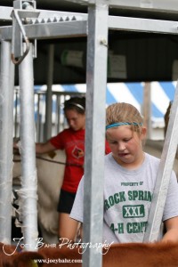 Jenna Hlavaty looks intently as she prepares her bucket calf, Rosie, for the 4-H Beef show at the 2011 Rush County Fair in LaCrosse, Kansas on Friday, August 5, 2011.