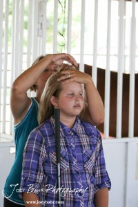 Camie Hlavaty fixes her daughter Jenna’s hair as they await the start of the 4-H Beef show at the 2011 Rush County Fair in LaCrosse, Kansas on Friday, August 5, 2011.