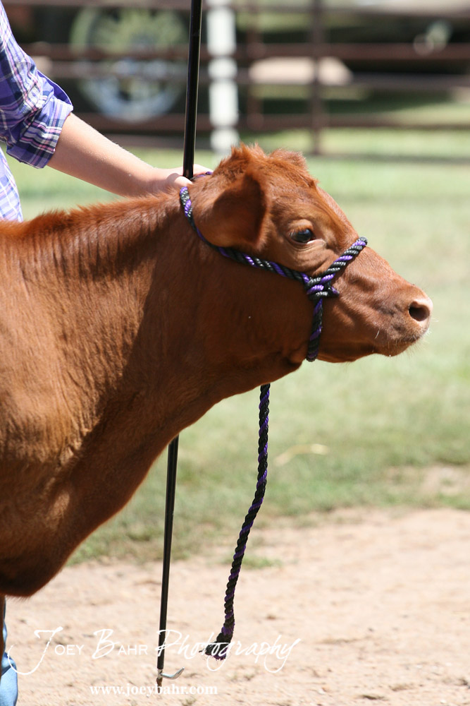 Rosie, Jenna Hlavaty’s bucket calf, waits in the sun before the 4-H Beef show at the 2011 Rush County Fair in LaCrosse, Kansas on Friday, August 5, 2011.