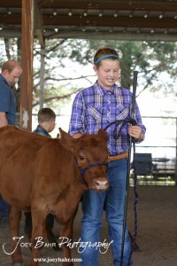 Jenna Hlavaty leads her bucket calf, Rosie, in the 4-H Beef show at the 2011 Rush County Fair in LaCrosse, Kansas on Friday, August 5, 2011