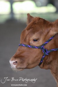 Jenna Hlavaty’s bucket calf, Rosie, looks on at the 4-H Beef show at the 2011 Rush County Fair in LaCrosse, Kansas on Friday, August 5, 2011.