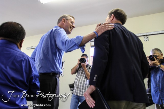 State Representative Paul Davis greets Governor Sam Brownback before the WIBW 2014 Kansas State Fair Gubernatorial debate between Governor Sam Brownback and State Represtentative Paul Davis at Bretz-Young Injury Lawyers Arena on the Kansas State Fairgrounds in Hutchinson, Kansas on September 6, 2014. (Photo: Joey Bahr, www.joeybahr.com)
