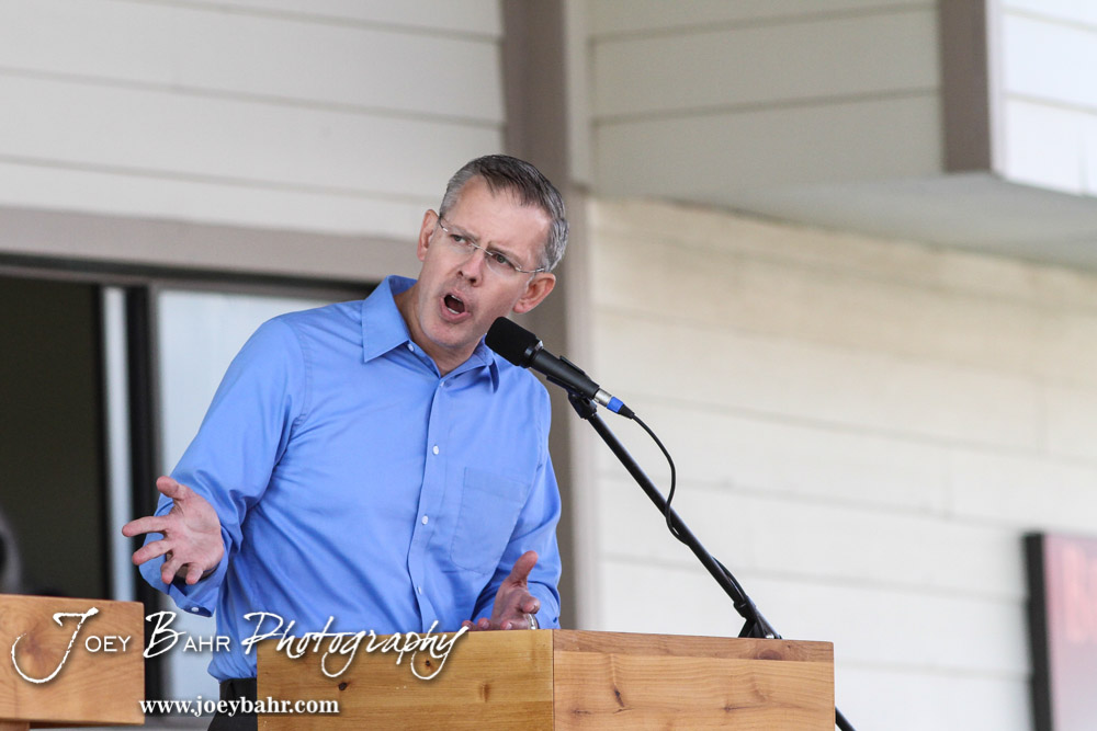 State Representative Paul Davis directs a response to Governor Sam Brownback during the WIBW 2014 Kansas State Fair Gubernatorial debate between Governor Sam Brownback and State Represtentative Paul Davis at Bretz-Young Injury Lawyers Arena on the Kansas State Fairgrounds in Hutchinson, Kansas on September 6, 2014. (Photo: Joey Bahr, www.joeybahr.com)