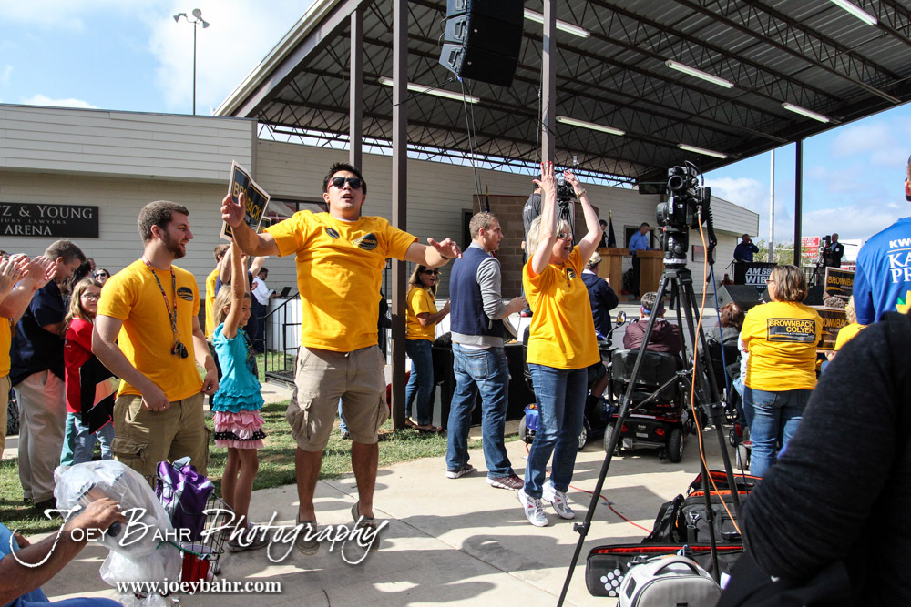 Supporters of Governor Sam Brownback try to pump up the crowd during the WIBW 2014 Kansas State Fair Gubernatorial debate between Governor Sam Brownback and State Represtentative Paul Davis at Bretz-Young Injury Lawyers Arena on the Kansas State Fairgrounds in Hutchinson, Kansas on September 6, 2014. (Photo: Joey Bahr, www.joeybahr.com)