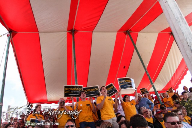 Supporters of Governor Sam Brownback stand up and wave signs during the WIBW 2014 Kansas State Fair Gubernatorial debate between Governor Sam Brownback and State Represtentative Paul Davis at Bretz-Young Injury Lawyers Arena on the Kansas State Fairgrounds in Hutchinson, Kansas on September 6, 2014. (Photo: Joey Bahr, www.joeybahr.com)