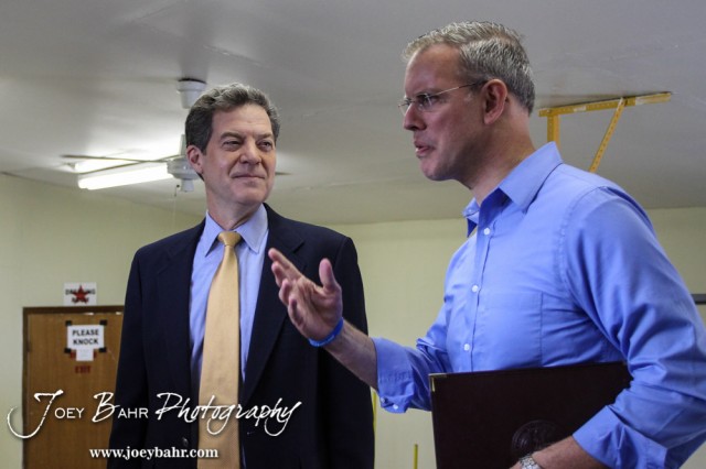 Governor Sam Brownback and State Representative Paul Davis chat prior to the WIBW 2014 Kansas State Fair Gubernatorial debate between Governor Sam Brownback and State Represtentative Paul Davis at Bretz-Young Injury Lawyers Arena on the Kansas State Fairgrounds in Hutchinson, Kansas on September 6, 2014. (Photo: Joey Bahr, www.joeybahr.com)