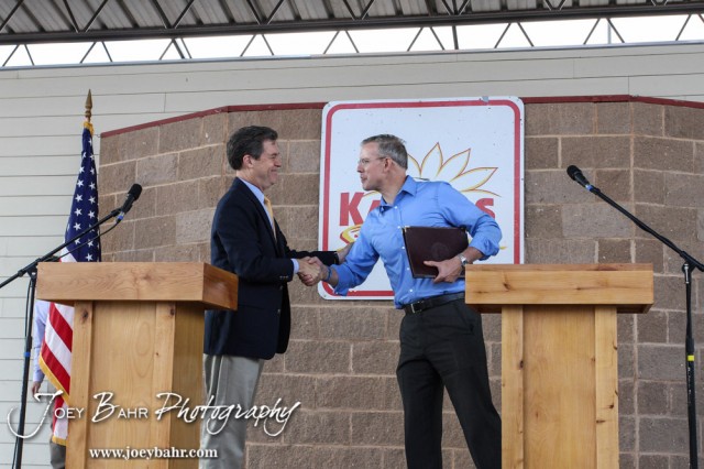 Governor Sam Brownback and State Representative Paul Davis shake hands following the WIBW 2014 Kansas State Fair Gubernatorial debate between Governor Sam Brownback and State Represtentative Paul Davis at Bretz-Young Injury Lawyers Arena on the Kansas State Fairgrounds in Hutchinson, Kansas on September 6, 2014. (Photo: Joey Bahr, www.joeybahr.com)