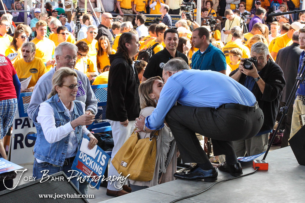 State Representative Paul Davis embraces his wife, Stephanie, following the WIBW 2014 Kansas State Fair Gubernatorial debate between Governor Sam Brownback and State Represtentative Paul Davis at Bretz-Young Injury Lawyers Arena on the Kansas State Fairgrounds in Hutchinson, Kansas on September 6, 2014. (Photo: Joey Bahr, www.joeybahr.com)