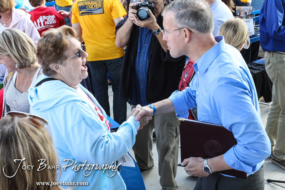 State Representative Paul Davis shakes the hand of Kansas Democratic Party Chairwoman Joan Wagnon after the WIBW 2014 Kansas State Fair Gubernatorial debate between Governor Sam Brownback and State Represtentative Paul Davis at Bretz-Young Injury Lawyers Arena on the Kansas State Fairgrounds in Hutchinson, Kansas on September 6, 2014. (Photo: Joey Bahr, www.joeybahr.com)