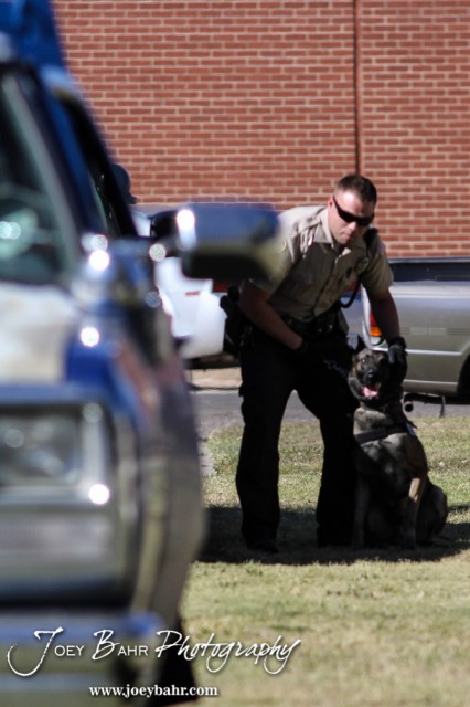 Great Bend Police Department Officer Adam Hale gives Kia instructions during the KVGB AM 1590 City Edition Show with the Great Bend Police Department at Eagle Radio Broadcast Center in Great Bend, Kansas on October 15, 2014. (Photo: Joey Bahr, www.joeybahr.com)