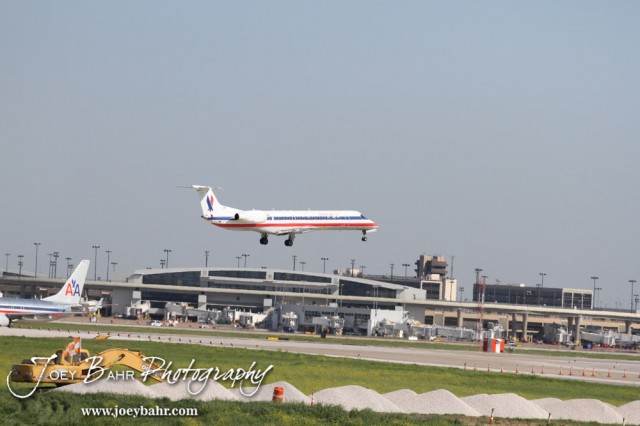 An American Eagle Canadair Regional Jet lands at Dallas-Fort Worth International Airport as seen from the Founder’s Plaza Aircraft Observation area in Dallas, Texas on April 15, 2014. (Photo: Joey Bahr, www.joeybahr.com)