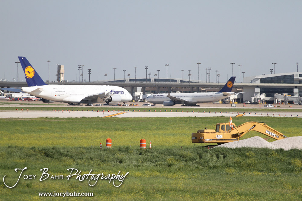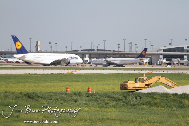 Lufthansa Flight 439 (LH439), an Airbus A330-300, taxis to take off at Dallas-Fort Worth International Airport as seen from the Founder’s Plaza Aircraft Observation area in Dallas, Texas on April 15, 2014. (Photo: Joey Bahr, www.joeybahr.com)