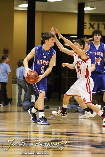 Otis-Bison Cougar Trevor Keller (#3) looks around Greeley County Jackrabbits defender Martin Veleta (#5) in the 2012 Class 1A Division II Boys State Championship Quarterfinals Game at Gross Memorial Coliseum at Fort Hays State University in Hays, Kansas on March 7, 2012. Photo: Joey Bahr