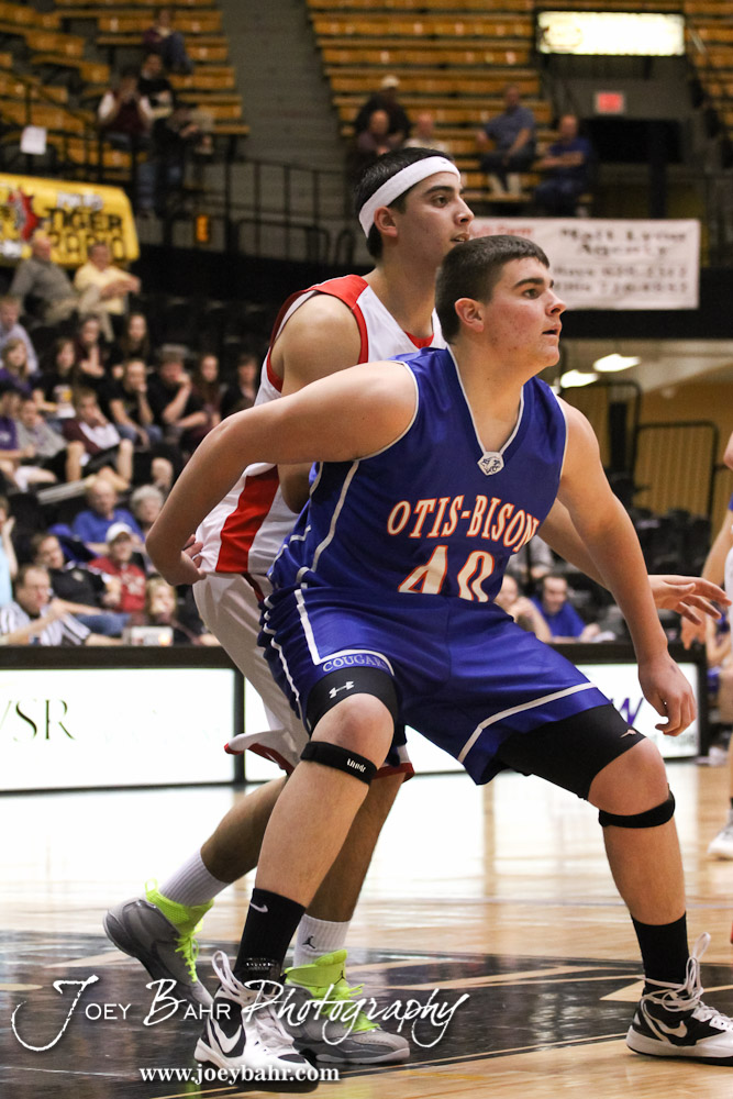 Otis-Bison Cougar Tyler Maier (#40) and Greeley County Jackrabbit Cesar Yanez (#15) battle for position down low in the 2012 Class 1A Division II Boys State Championship Quarterfinals Game at Gross Memorial Coliseum at Fort Hays State University in Hays, Kansas on March 7, 2012. Photo: Joey Bahr