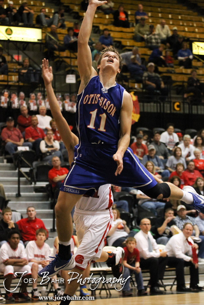 Dylan Wissman (#11) of the Otis-Bison Cougars goes up for a layup against the Greeley County Jackrabbits in the 2012 Class 1A Division II Boys State Championship Quarterfinals Game at Gross Memorial Coliseum at Fort Hays State University in Hays, Kansas on March 7, 2012. Photo: Joey Bahr