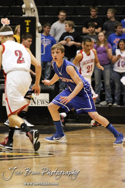 Justus Bartonek (#1) of the Otis-Bison Cougars watches Greeley County Jackrabbit Arthur Govert (#2) in the 2012 Class 1A Division II Boys State Championship Quarterfinals Game at Gross Memorial Coliseum at Fort Hays State University in Hays, Kansas on March 7, 2012. Photo: Joey Bahr