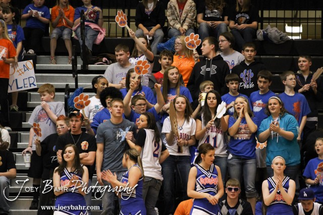 Otis-Bison Cougar students react to a play in the 2012 Class 1A Division II Boys State Championship Quarterfinals Game against the Greeley County Jackrabbits at Gross Memorial Coliseum at Fort Hays State University in Hays, Kansas on March 7, 2012. Photo: Joey Bahr