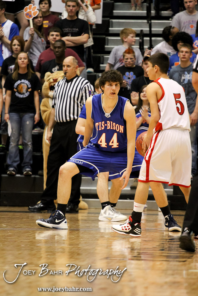 Brandon Pechanec (#44) of the Otis-Bison Cougars defends against Greeley County Jackrabbit Martin Veleta (#5) in the 2012 Class 1A Division II Boys State Championship Quarterfinals Game at Gross Memorial Coliseum at Fort Hays State University in Hays, Kansas on March 7, 2012. Photo: Joey Bahr