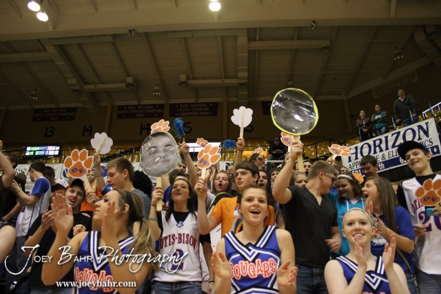 Otis-Bison Cougar fans cheer as the 2012 Class 1A Division II Boys State Championship Quarterfinals Game against the Greeley County Jackrabbits begins at Gross Memorial Coliseum at Fort Hays State University in Hays, Kansas on March 7, 2012. Photo: Joey Bahr