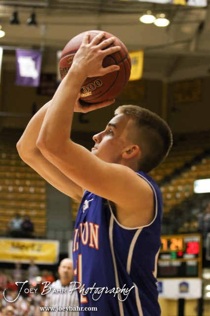 Otis-Bison Cougar Zachary Stejskal (#14) takes a three point shot against the Greeley County Jackrabbits in the 2012 Class 1A Division II Boys State Championship Quarterfinals Game at Gross Memorial Coliseum at Fort Hays State University in Hays, Kansas on March 7, 2012. Photo: Joey Bahr