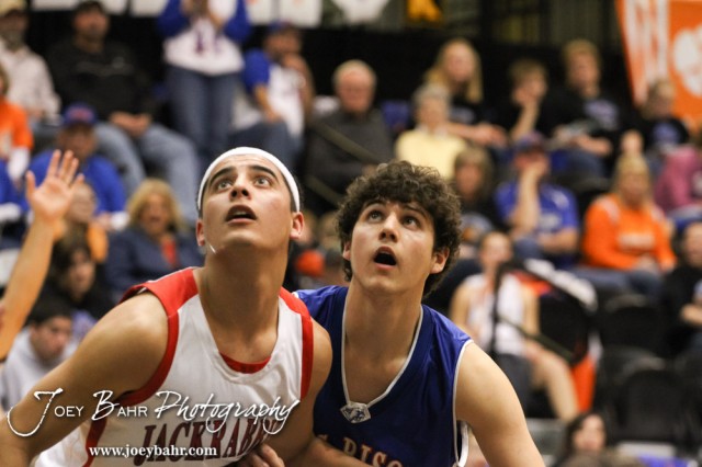 Greeley County Jackrabbit Cesar Yanez (#15) and Otis-Bison Cougar Brandon Pechanec (#44) watch the basketball during a free throw attempt in the 2012 Class 1A Division II Boys State Championship Quarterfinals Game at Gross Memorial Coliseum at Fort Hays State University in Hays, Kansas on March 7, 2012. Photo: Joey Bahr