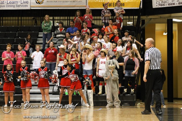 Greeley County Jackrabbit students cheer on their players against the Otis-Bison Cougars in the 2012 Class 1A Division II Boys State Championship Quarterfinals Game at Gross Memorial Coliseum at Fort Hays State University in Hays, Kansas on March 7, 2012. Photo: Joey Bahr