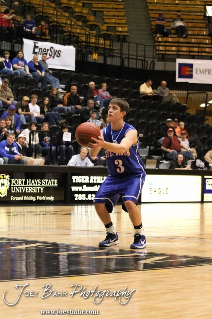 Trevor Keller (#3) of the Otis-Bison Cougars shoots a free throw attempt from a Technical Foul against the Greeley County Jackrabbits in the 2012 Class 1A Division II Boys State Championship Quarterfinals Game at Gross Memorial Coliseum at Fort Hays State University in Hays, Kansas on March 7, 2012. Photo: Joey Bahr
