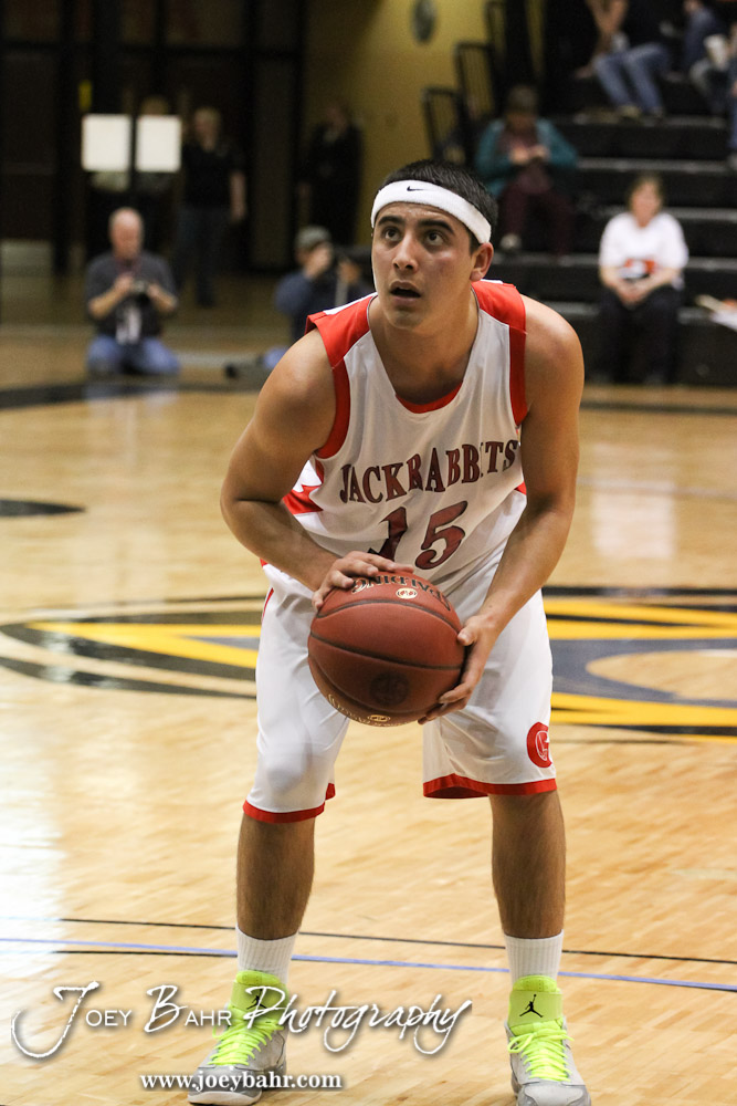Cesar Yanez (#15) of the Greeley County Jackrabbits shoots a free throw against the Otis-Bison Cougars in the 2012 Class 1A Division II Boys State Championship Quarterfinals Game at Gross Memorial Coliseum at Fort Hays State University in Hays, Kansas on March 7, 2012. Photo: Joey Bahr