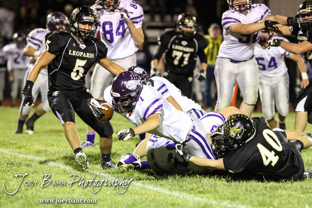 Meade Buffalo Dylan Wondra (#7) stretches for a few more yards as LaCrosse Leopard Willie Freemyer (#40) tackles him during the KSHSAA Class 2-1A Regional Football game with Meade at LaCrosse with LaCrosse winning 34 to 0 at Bill Schoendaller Athletic Field in LaCrosse, Kansas on November 7, 2014. (Photo: Joey Bahr, www.joeybahr.com)