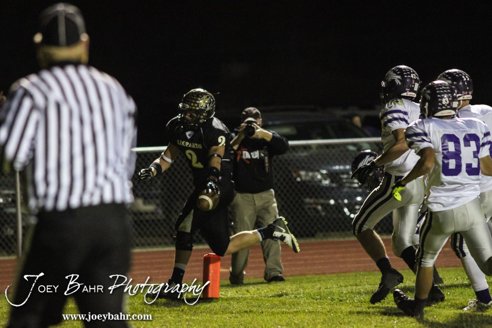 LaCrosse Leopard Sheldon Schmidt (#2) scores a touchdown during the KSHSAA Class 2-1A Regional Football game with Meade at LaCrosse with LaCrosse winning 34 to 0 at Bill Schoendaller Athletic Field in LaCrosse, Kansas on November 7, 2014. (Photo: Joey Bahr, www.joeybahr.com)