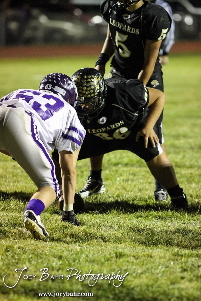 LaCrosse Leopard Tyler Davis (#66) prepares to hike the ball during the KSHSAA Class 2-1A Regional Football game with Meade at LaCrosse with LaCrosse winning 34 to 0 at Bill Schoendaller Athletic Field in LaCrosse, Kansas on November 7, 2014. (Photo: Joey Bahr, www.joeybahr.com)