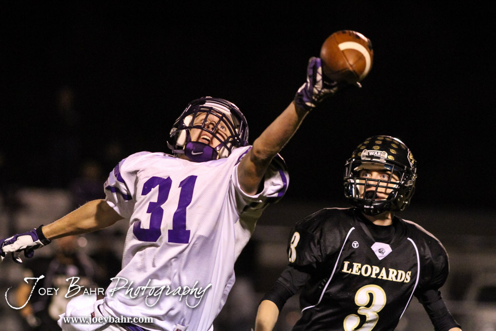 Meade Buffalo Nick Finke (#31) almost catches a pass during the KSHSAA Class 2-1A Regional Football game with Meade at LaCrosse with LaCrosse winning 34 to 0 at Bill Schoendaller Athletic Field in LaCrosse, Kansas on November 7, 2014. (Photo: Joey Bahr, www.joeybahr.com)