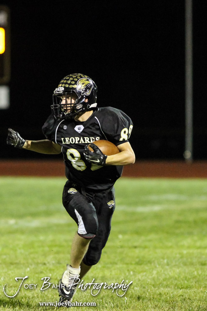 LaCrosse Leopard Chance Cosair (#82) runs with the ball during the KSHSAA Class 2-1A Regional Football game with Meade at LaCrosse with LaCrosse winning 34 to 0 at Bill Schoendaller Athletic Field in LaCrosse, Kansas on November 7, 2014. (Photo: Joey Bahr, www.joeybahr.com)