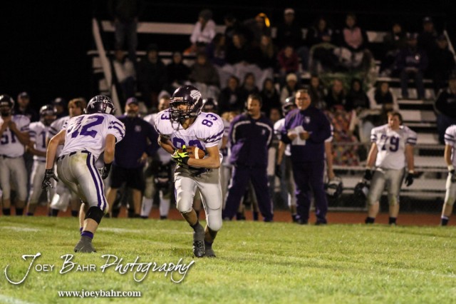 Meade Buffalo Dakota Messer (#83) carries the ball during the KSHSAA Class 2-1A Regional Football game with Meade at LaCrosse with LaCrosse winning 34 to 0 at Bill Schoendaller Athletic Field in LaCrosse, Kansas on November 7, 2014. (Photo: Joey Bahr, www.joeybahr.com)