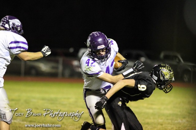 Meade Buffalo Ryan Friesen (#42) pushes LaCrosse Leopard Chase Klozenbucher (#9) out of the way during the KSHSAA Class 2-1A Regional Football game with Meade at LaCrosse with LaCrosse winning 34 to 0 at Bill Schoendaller Athletic Field in LaCrosse, Kansas on November 7, 2014. (Photo: Joey Bahr, www.joeybahr.com)