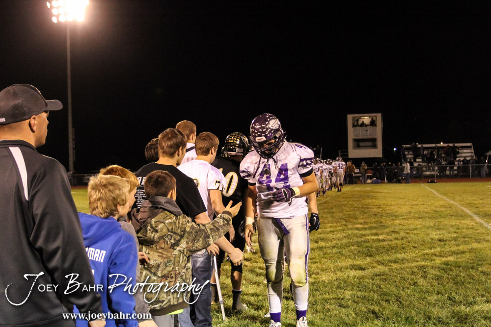Members of the Meade Buffaloes and LaCrosse Leopards shake hands following the KSHSAA Class 2-1A Regional Football game with Meade at LaCrosse with LaCrosse winning 34 to 0 at Bill Schoendaller Athletic Field in LaCrosse, Kansas on November 7, 2014. (Photo: Joey Bahr, www.joeybahr.com)